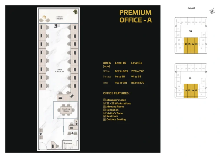 The Standard Office layouts are optimized for startups, small teams, or satellite offices. These floor plans provide an efficient open-plan workspace with room for:Reception areaWorkspace for multiple desksFlexible breakout areaEasy installation of office furnitureAmple daylight through large windowsPerfect for professionals seeking a functional yet stylish office footprint at an accessible entry level.
