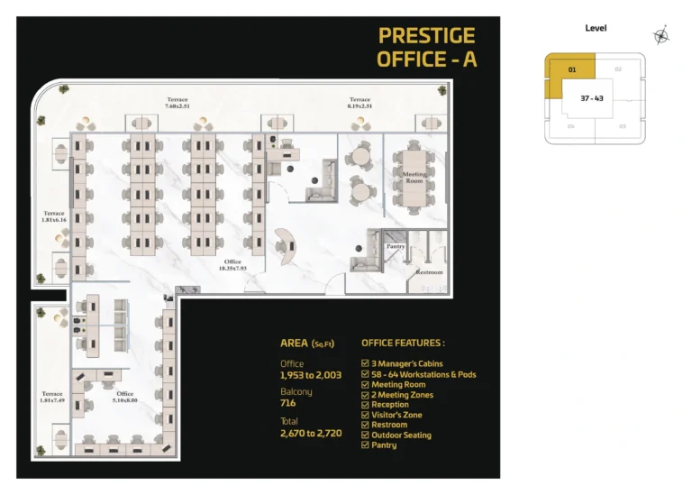 The Prestige Office layouts represent the most flexible and expansive work environments within ShahrukhZ. These floor plans are ideal for large corporate headquarters, regional offices, or premium enterprise operations. Key features include:Multiple executive suitesLarge boardroom/conference facilitiesOpen collaborative spacesDedicated reception and lobby zonesFlexible partitioning optionsAmple natural light across the floor platePrestige layouts allow bespoke fit-outs and branding, making them suitable for high-profile companies seeking a commanding Dubai address.